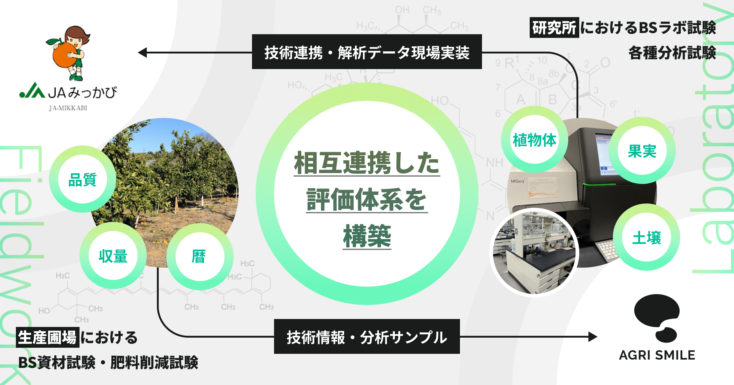 株式会社AGRI SMILEは、独自のバイオスティミュラント(以下、BS)資材評価系を用いて、未利用資源を活用したBS資材の研究開発及び評価事業を推進しています。今年度より、浜松市ファンドサポート事業費交付金による支援の下、三ヶ日町農業協同組合と共同で、温州みかん生産圃場におけるBS資材の評価体系構築に向けた実証試験を開始しました。これまでAGRI SMILEが培ってきた研究室での評価体系に加えて、実地での評価体系を構築することで、BS資材の普及加速につながることが期待されます。みかん果実のみならず、植物体や土壌への影響を微生物、代謝物、元素の観点から捉え、BS資材の実用化に向けた技術知見を獲得します。JAみっかびでの取り組みを起点とし、他の産地、品目へ拡げることにより、日本におけるBS資材普及と、農業の持続可能性を高めることに貢献します。