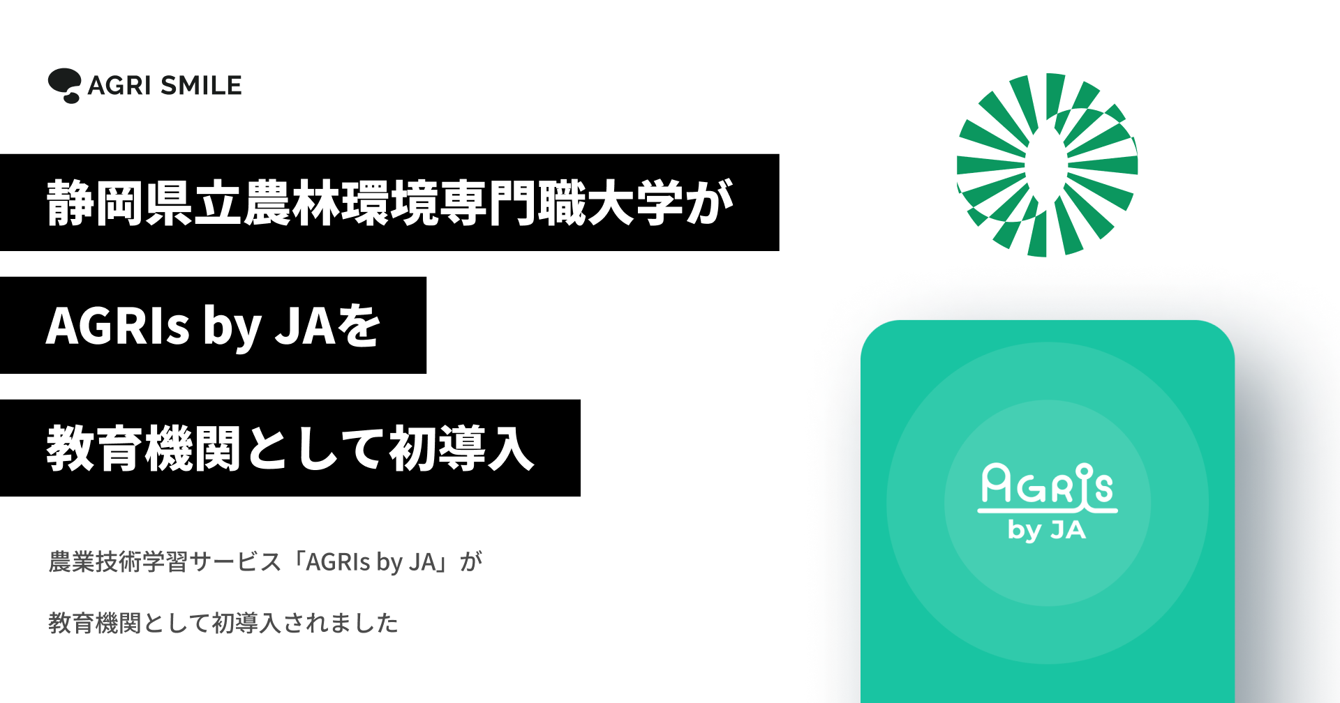 株式会社AGRI SMILEは、2022年7月より静岡県立農林環境専門職大学および同短期大学部(所在地:静岡県磐田市、学長:鈴木 滋彦)へ、プロの栽培技術を動画で学べる「AGRIs by JA(読み:アグリス バイ ジェーエー)」の提供を開始します。AGRIs by JAは国内有数の農畜産物取扱高を有する4つのJAとともに運営する営農指導支援サービスであり、教育機関への導入は今回が初めてです。